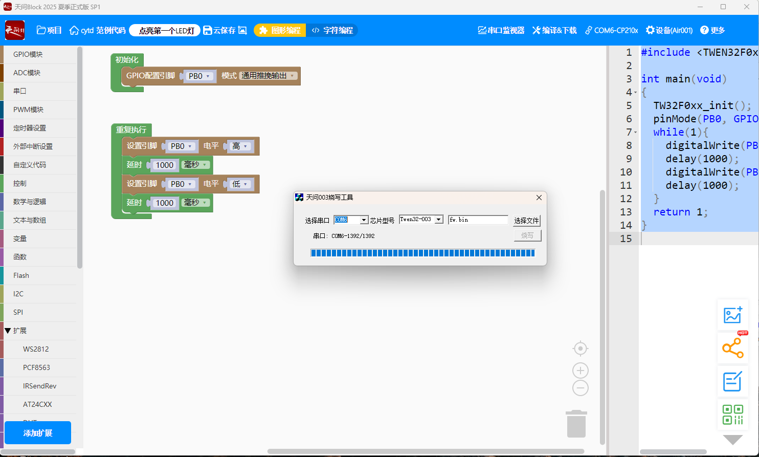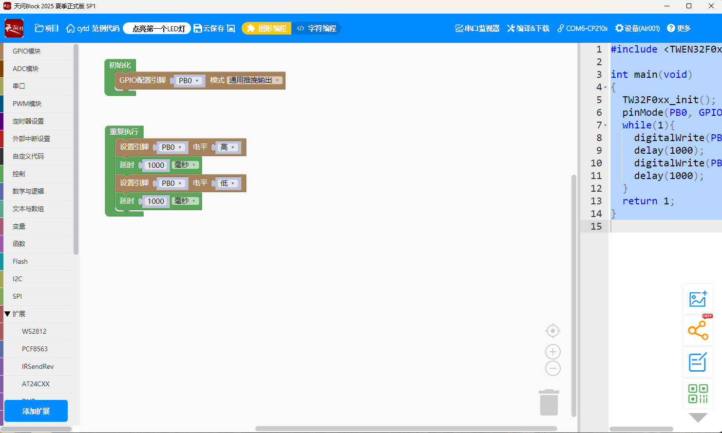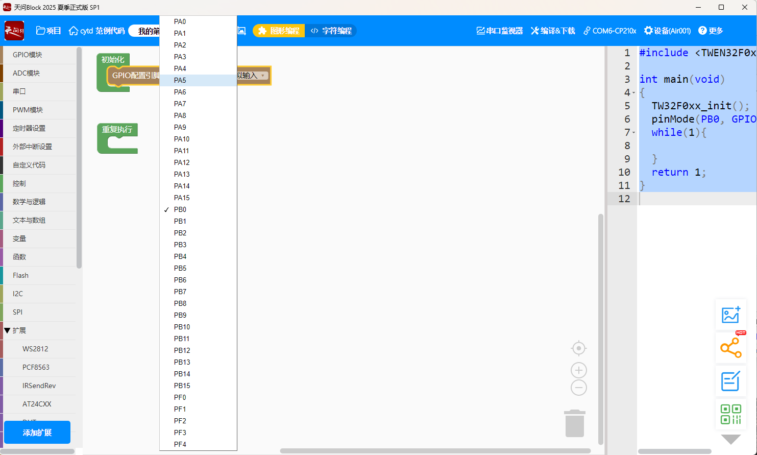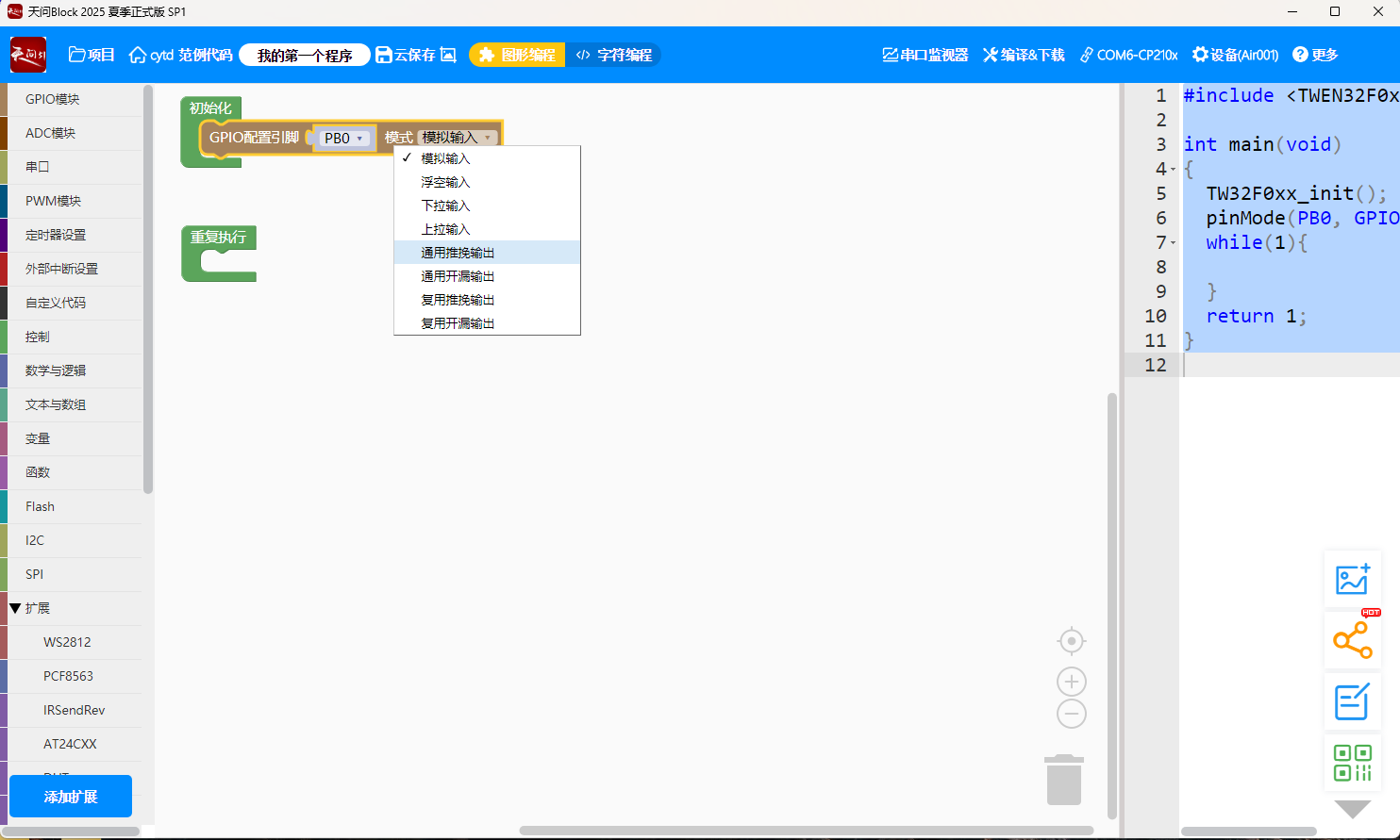 在左边的积木分类里面的找到GPIO模块拉出一个GPIO配置积木,选择对应的IO引脚我这个开发板上的LED灯是在PB0