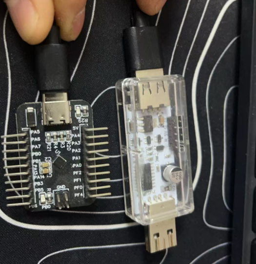 一般天问Block软件回自动识别到,在把数据线的一头插在下载器另外一头插到开发板的Type-C口如下图。